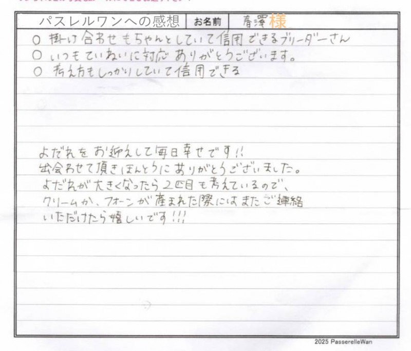 ブリーダーさんとも長いお付き合いをさせて頂きながらこの子を生涯大切に・・・