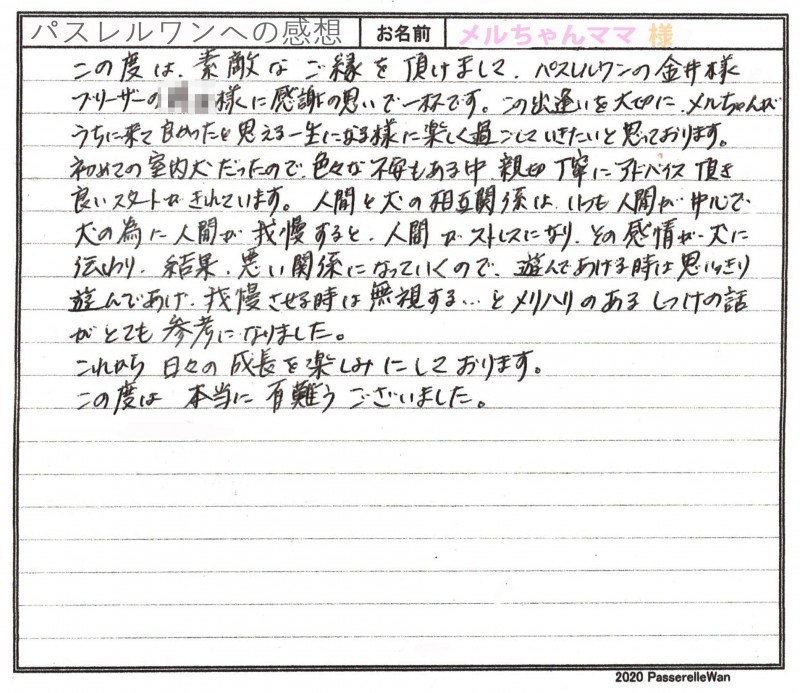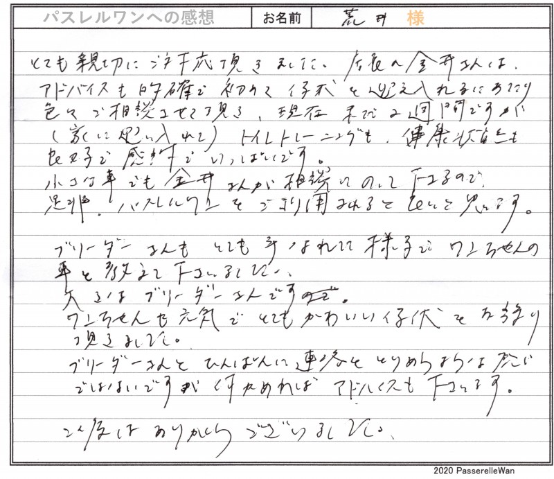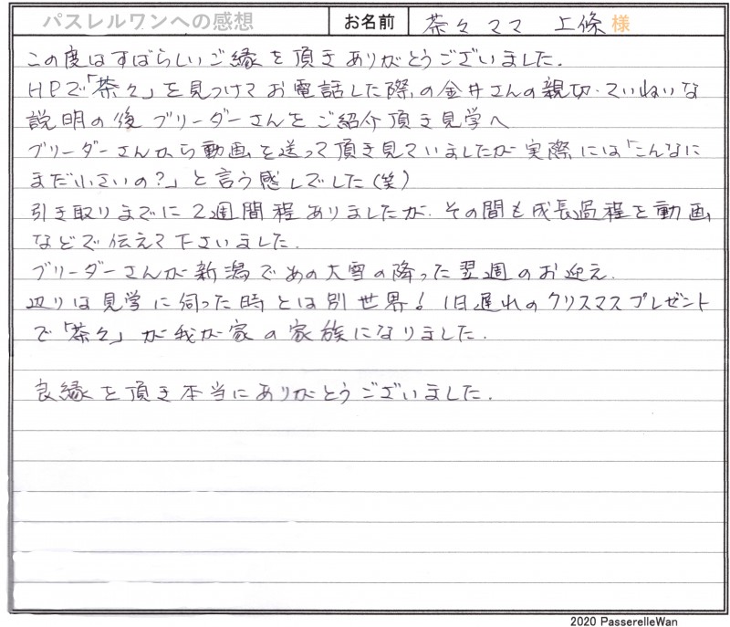 東京都より新潟県犬舎へご見学・お迎えと二度お越しくださいました。 フレンチブルドッグが大好きなご家族様で、優良な子犬との出会いを求められ、距離など関係なく、お迎えの際にはご家族様皆様でお越しくださいました^^ またご感想の中で大変貴重なご意見もお書きくださり大変うれしく思います。展示販売というのは子犬のストレスを考えなくなっていかなくてはなりません。 今後もより良いペット業界に変えていくため、微力ながら誠意一杯努めてまいります! どうぞ素敵なフレンチブルドッグライフをお送りください・・・☆★☆ この度は当店をご利用いただき誠にありがとうございます。