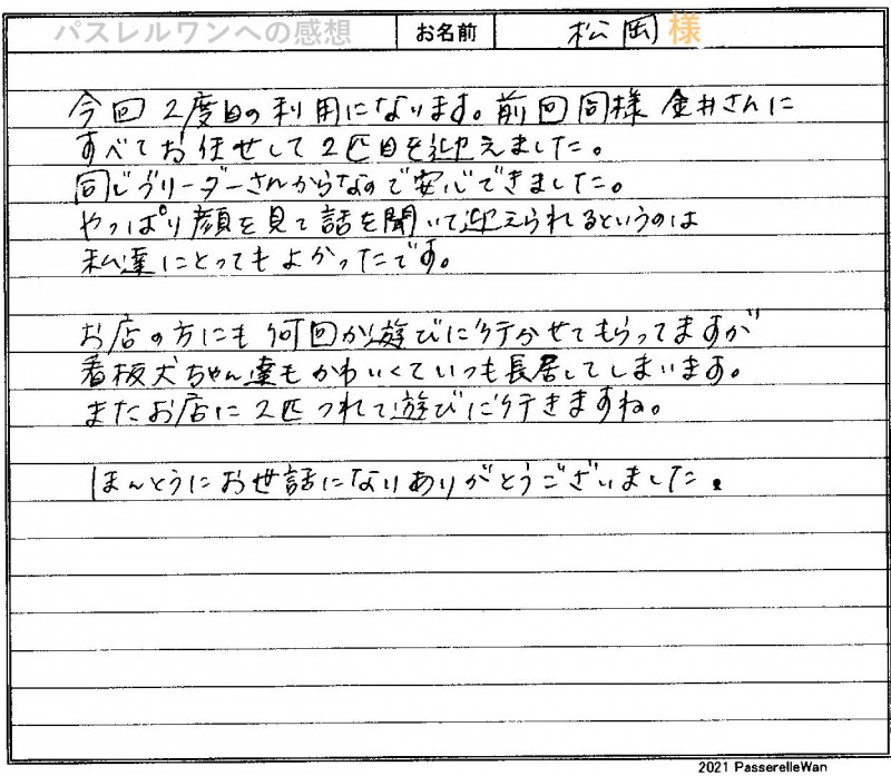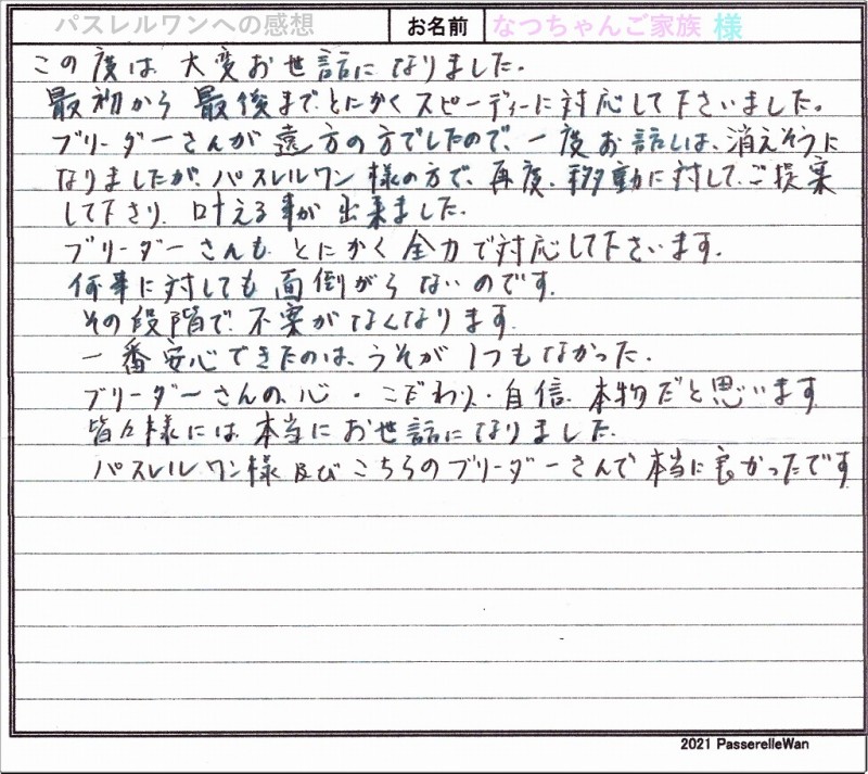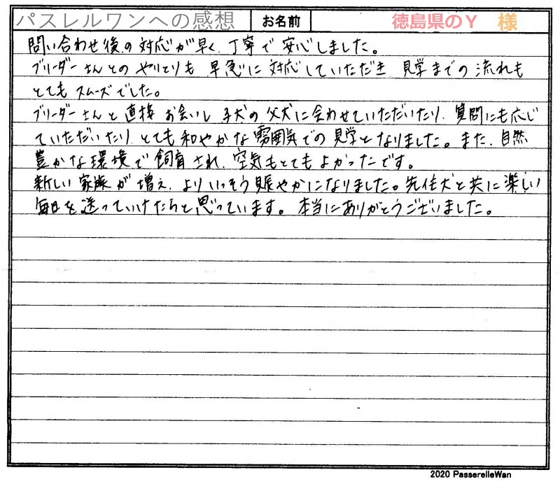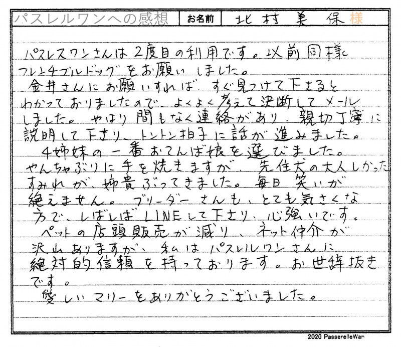 約5年前にフレンチブルドッグのすみれちゃんをお迎え頂き、この度で二頭目の良縁を頂戴いたしました。 愛知県より徳島県犬舎へご見学・お迎えと二度足を運んでくださいました。愛情いっぱい育てるブリーダーさんともお会い頂きご安心頂けたようです。 優しいご家族様のもとで、マリーちゃん&すみれちゃんコンビのくすっと笑わしてくれるエピソードなどまたお聞かせください^^ どうぞ素敵なフレンチブルドッグライフをお送りください・・・☆★☆ この度は当店をご利用いただき誠にありがとうございます。