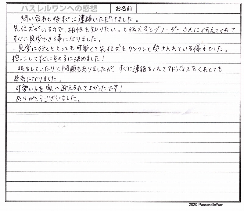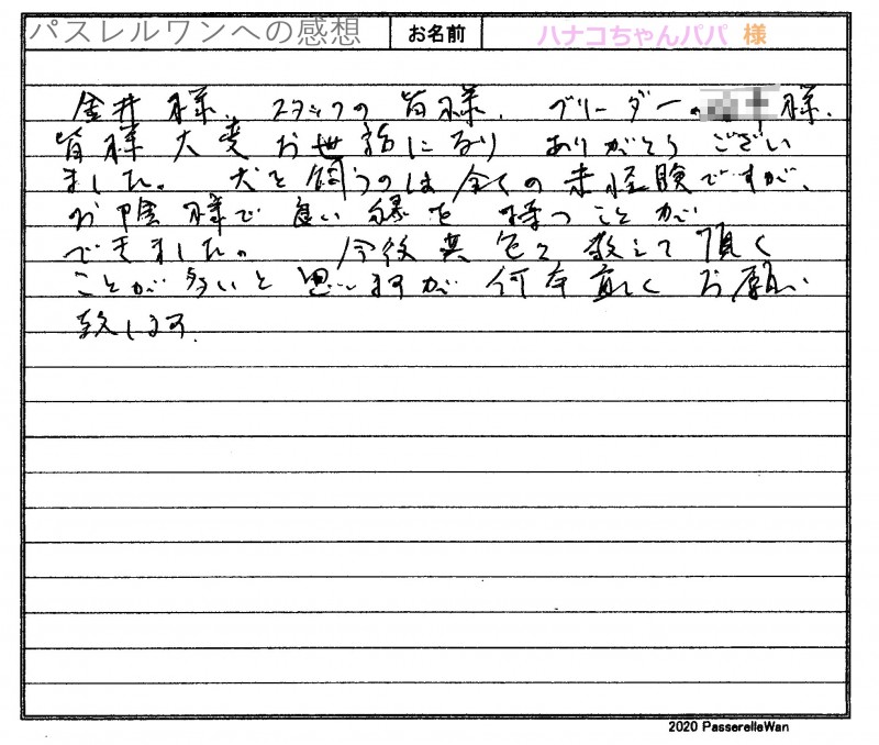 子犬選びの窓口より当方へご来社の上、そちらよりスタートいたしました。 大阪府より兵庫県犬舎へご見学にお越し頂きました^^ 良縁が結ばれお引き渡しの際には一回り大きく、また元気いっぱいのはなこちゃんに喜んで頂けました☆ お迎え後も専門店の方に遊びにもくださり、はなこちゃんのたくましい成長に皆で喜んでおります♪ また困ったことがあられましたら、いつでもご相談、ご来店くださいませ! どうぞ素敵なフレンチブルドッグライフをお送りください・・・☆★☆ この度は当店をご利用いただき誠にありがとうございます。