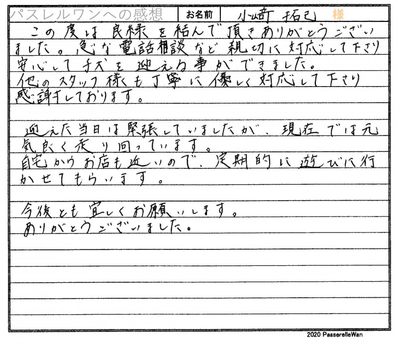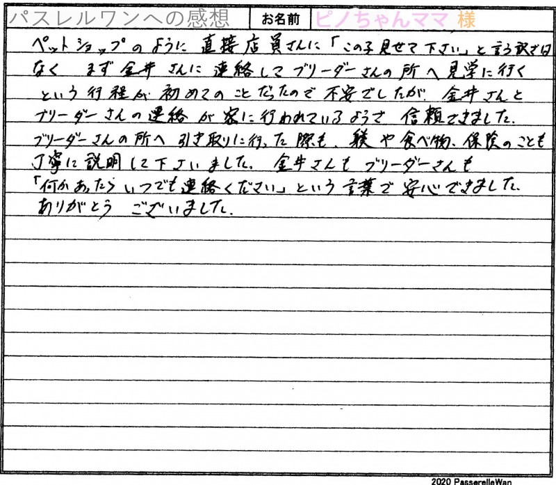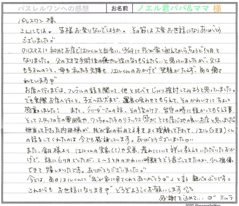 何度かご来社くださり、当スタッフへご相談も頂戴しており、当方にて募集中でございました、つきま(現在はノエル君)を気にかけてくださっておりました。 性格の大変穏やかなノエル君に闘病中でしたお父様のことも考えあまりガサツな子は難しいかなとのお考えもあり、ノエル君に運命を感じてくださいました。 当スタッフたちにも大変人気のあったノエル君、スタッフたちも少しさびしさ、嬉しさ半分で巣立ちの日を見送らせて頂きました^^ 大切に暖かく育ててくださるご家族様ですので、安心してお引き渡しさせて頂けましたm(__)m どうぞ素敵なフレンチブルドッグライフをお送りください・・・☆★☆ この度は当店をご利用いただき誠にありがとうございます。