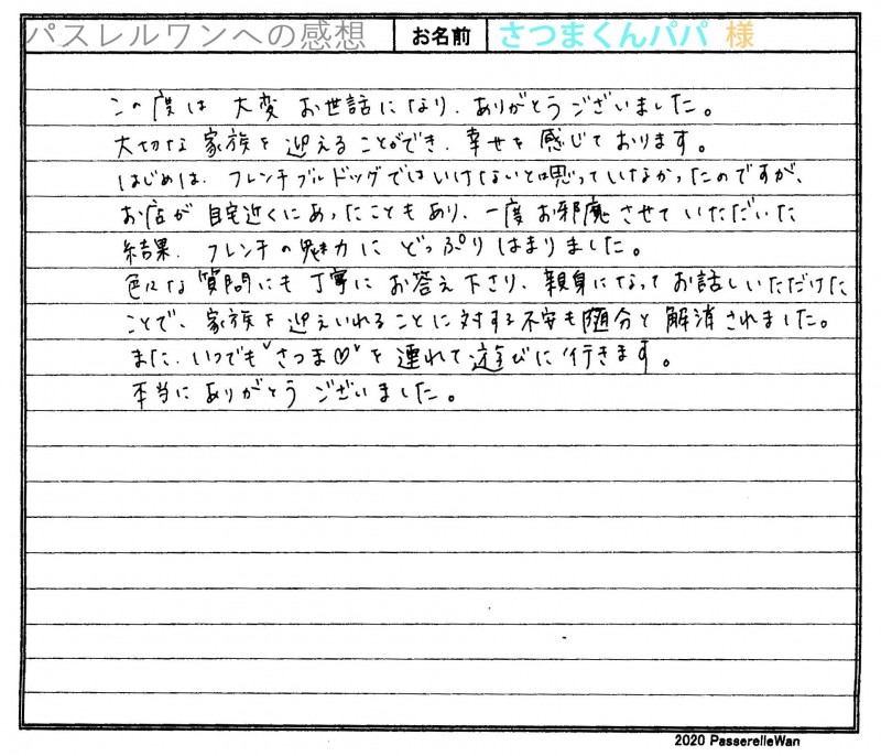 子犬選びの窓口よりご相談いただき、はじめはボストンテリアとフレンチブルドッグでお悩みの所よりスタートいたしましたね^^ そんな中、お迎え頂きましたパイド柄のさつま君をご見学いただき、はじめは奥様お一人でしたが、その可愛さ、フレブルの魅力に後日ご主人様も会いにお越しくださり運命の赤い糸で結ばれました^^ お迎え後もシャンプーや洋服など、さつま君を連れ遊びに来てくださり、成長をいつも拝見させてくださり大変うれしく思います^^ 今後も困ったことなどございましたらご遠慮なくいつでもご相談ください。 どうぞ素敵なフレンチブルドッグライフをお送りください・・・☆★☆ この度は当店をご利用いただき誠にありがとうございます。
