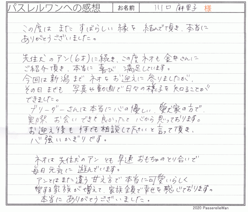 先住犬のアンちゃんに続きこの度は二頭目のネオ君をお迎え頂きました。 ご見学前にはご来社いただき、新潟県の掲載情報を事前にご相談いただきました。 新潟県まで距離もある中大阪から、ネオ君に会いに行ってくださり、この度もしっかり赤い糸で結ばれていたのだと思います^^4 今後も困ったことなどございましたらご遠慮なくいつでもお問い合わせください。 どうぞ素敵なフレンチブルドッグライフをお送りください・・・☆★☆ この度は当店をご利用いただき誠にありがとうございます。