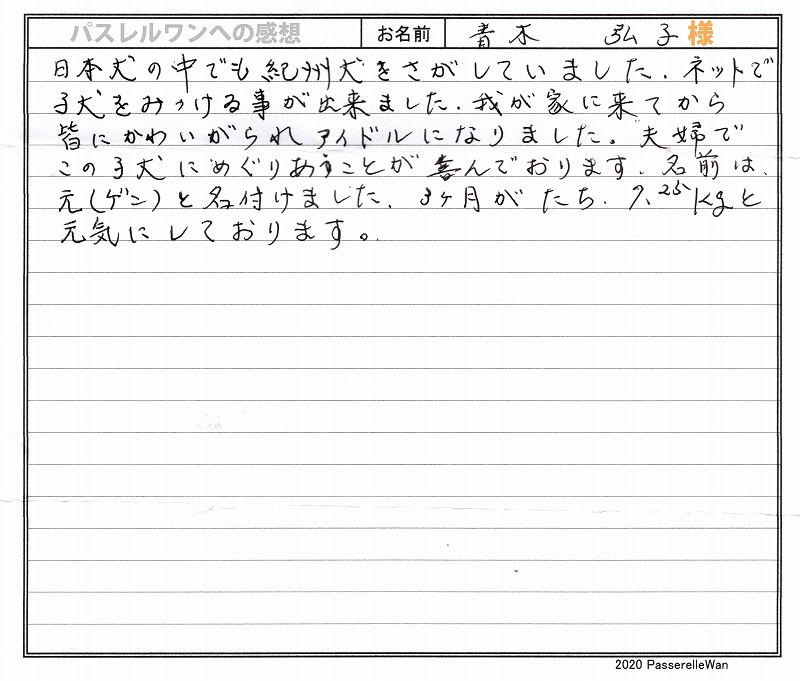優良な可愛い紀州犬のワンコをお迎えされたいと当方へご相談いただきました。 こだわりの犬舎で育つ元くんとの再会は、東京駅で嬉しさの感情があふれ出てまいりました^^ お迎え後も元くんの成長写真をまめに送ってくださり当方スタッフ共々大変うれしく思います。 今後も困ったことなどございましたらご遠慮なくいつでもお問い合わせください。 どうぞ素敵な紀州犬ライフをお送りください・・・☆★☆ この度は当店をご利用いただき誠にありがとうございます。