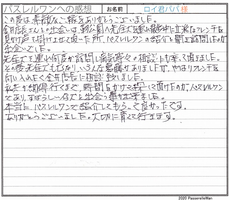 和歌山県犬舎へご見学・お迎えと二度お越しいただきました。 当店には虹の橋を渡る前に先住犬のロア君とお店によく遊びにくださり、虹の橋を渡ってしまってからも、様々な葛藤を乗り越えられ、お店にも何度も足を運んで下さり、この度、待ちに待った運命の日を迎えられましたm(__)m 目の肥えたこだわり派のご家族様へ気に入っていただき当方ブリーダーさん共に大変うれしく思います。 どうぞ素敵なフレンチブルドッグライフをお送りください・・・☆★☆ この度は当店をご利用いただき誠にありがとうございます。