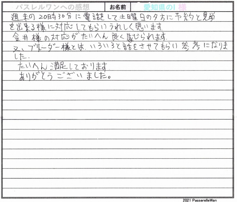 当日は同県より岐阜県犬舎へ小学校のお子様も連れ皆様でご見学にお越しくださいました。 フレンチブルドッグの飼育経験ならびにご家族様でワンコを飼われるのは初めてということもあり、はじめはご不安もあったことと思います。 当日お会い頂きましたブリーダーさんの真摯なご対応と当然ながら可愛い子犬に迷いは消えられたのではないかなと思います^^ 今後も困ったことなどございましたらご遠慮なくいつでもお問い合わせください。 どうぞ素敵なフレンチブルドッグライフをお送りください・・・☆★☆ この度は当店をご利用いただき誠にありがとうございます。