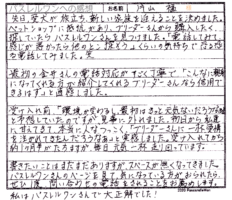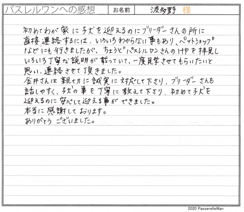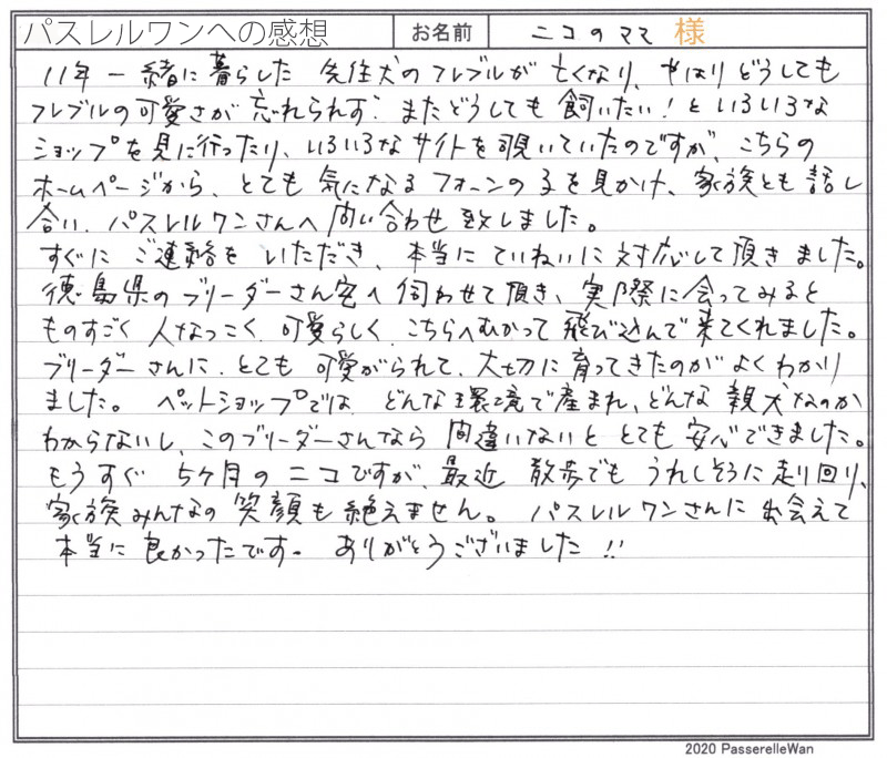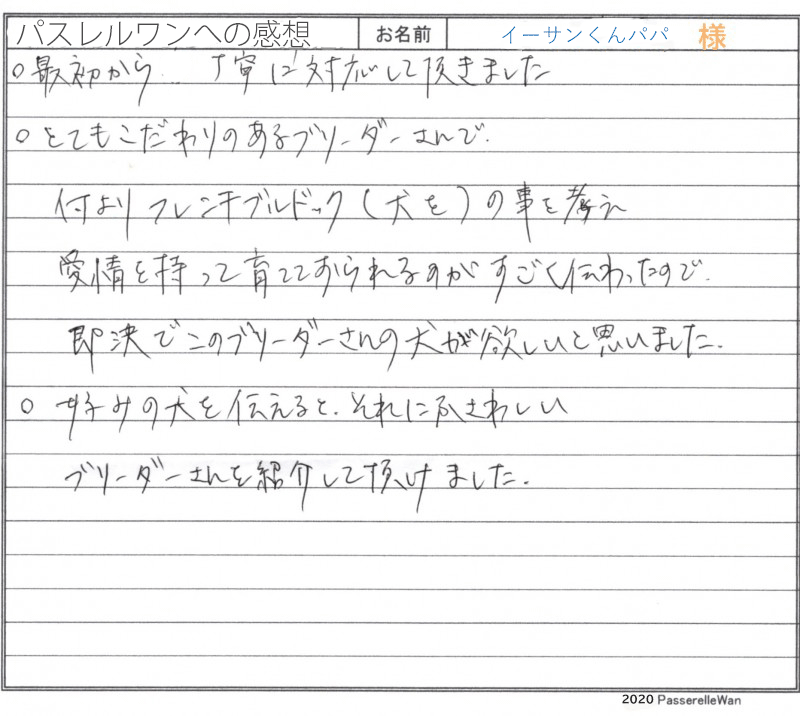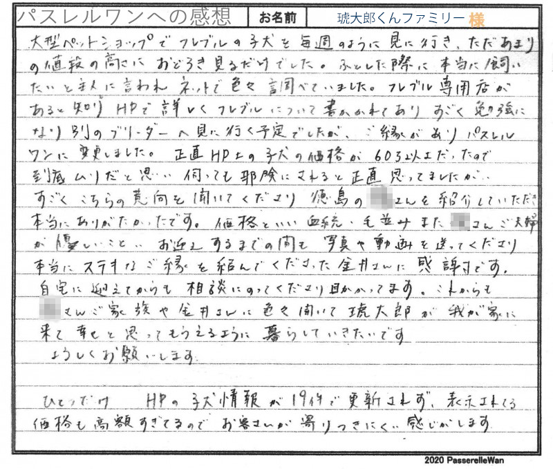 当方へご来社の上、子犬選びの窓口よりご相談いただき、徳島県犬舎へご見学いただき良縁が結ばれました。 ご家族様共に、大変良い縁と喜んで頂けて仕事冥利に尽きる思いでございます。 フレンチブルドッグ専門店のパスレルフレンチでは、パスレルワンと共有し子犬情報をアップしておりませんので、少しわかり辛い作りとなっていたようで、大変貴重なご意見として今後にお役立てさせて頂きます^^ 兄弟たちも近隣に巣立った子たちも多いですので、いずれ兄妹再会の場を設けられれば嬉しいですね^^ どうぞ素敵なフレンチブルドッグライフをお送りください・・・☆★☆ この度は当店をご利用いただき誠にありがとうございます。