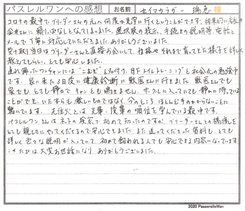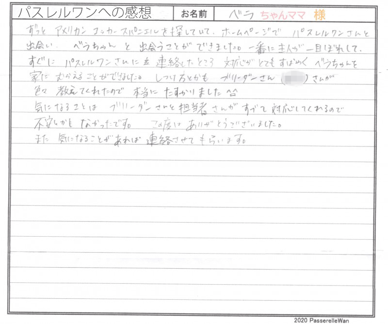大阪府より奈良県提携犬舎子犬へご見学、お迎えと二度お越しくださいました。 アメリカンコッカースパニエルと暮らされたいとご家族様でお探しの中、ベラちゃんに運命の赤い糸を感じて頂きご見学に皆様でお越し頂きました。 ご一緒にお越し頂いたお子様達も大変喜んで頂けて、当方ブリーダーさん共に良縁に大変感謝しております^^ また落ち着かれましたら、成長のご報告など楽しみにお待ちしております♪ どうぞ、素敵なアメリカンコッカースパニエルライフをお送りください・・・☆★☆ この度は当店をご利用いただき誠にありがとうございます。