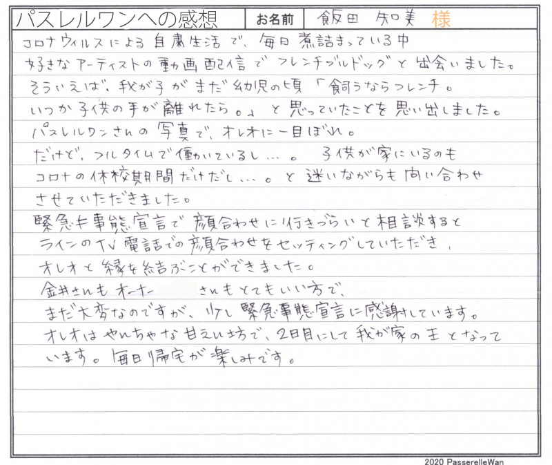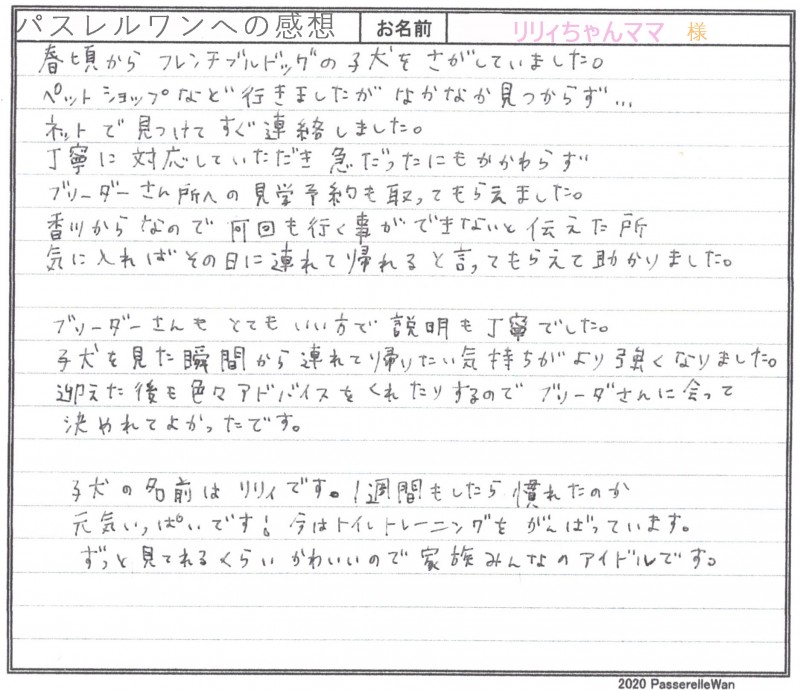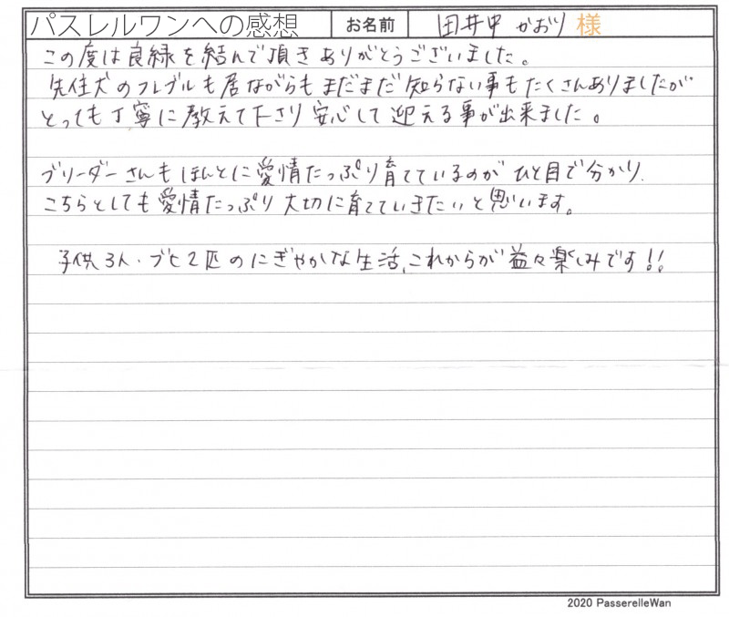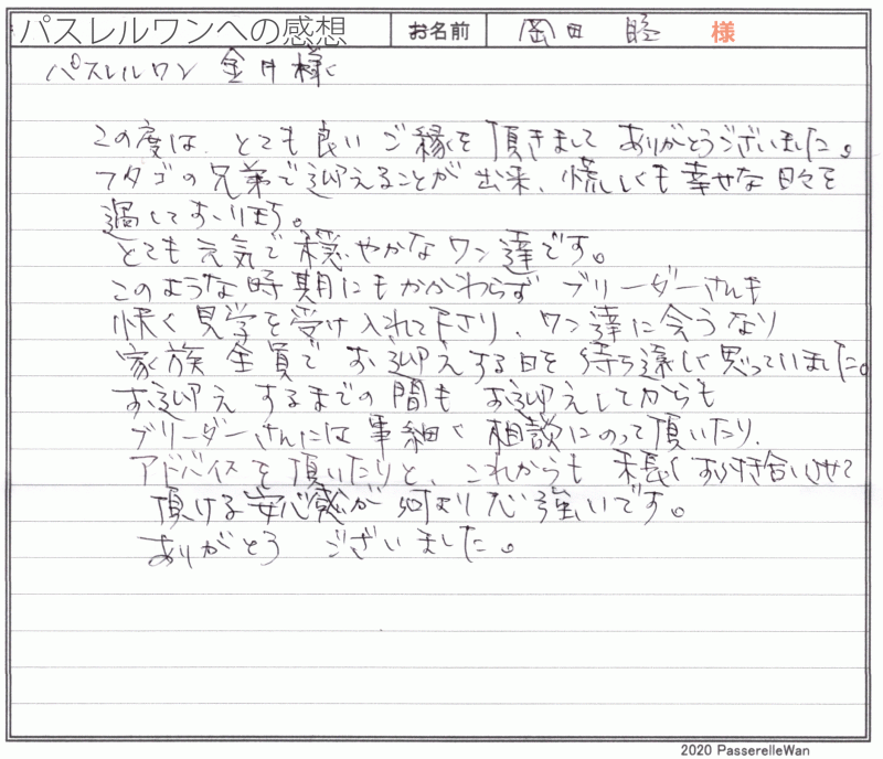 大阪府提携犬舎へご見学、お迎えと二度ご家族様ご一緒にお越し頂きました。 先住犬もフレンチブルドッグとお暮らしの中、クリームの男の子を多頭飼いにと、こだわりを持ち探されておられました。 そんな中、運命的な偶然、いや必然の出会いがあり、この度良縁が結ばれました。 お迎え後も先住犬と共に日々ブヒブヒ楽しい日々を送っております^^ どうぞ素敵なフレンチブルドッグライフをお送りください・・・☆★☆ この度は当店をご利用いただき誠にありがとうございます。