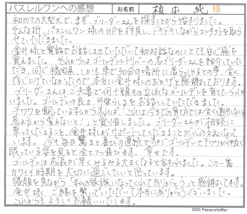 同県より福岡県提携犬舎へご見学にお越し頂き、良縁を頂戴いたしました。 奥様はチワワの飼育経験をお持ちでしたが、ご見学日、ご感想にもお書きくださった、「今まででの育て方では通用しない、覚悟を決めないと!」というお言葉が大型犬と暮らすということを良い意味で物語る良いお心構えとして響いてまいりました。 パートナー様はゴールデンの飼育経験もお持ちのようで安心しておりますが、 飼育で困った事などございましたらご遠慮なくご相談くださいませ! どうぞ素敵なゴールデンレトリーバーライフをお送りください・・・☆★☆ この度は当店をご利用いただき誠にありがとうございます。