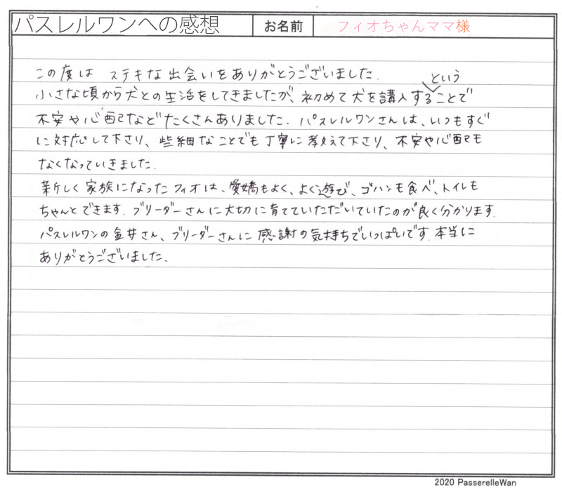 ワンちゃんと暮らされたいとお引越しもご計画の上、この度の良縁を頂戴いたしました。 福岡県犬舎の元大切に育てられらフィオちゃんのお迎え日を毎日楽しみにお待ちいただきました^^ いろいろとご不安もあったことと思いますが、事前にご質問もご準備され、一つ一つクリアしていかれましたね☆ お迎え後も少し距離はございますが、困った際にはご遠慮なくご連絡ください! どうぞ素敵なアメリカンコッカースパニエルライフをお送りください・・・☆★☆ この度は当店をご利用いただき誠にありがとうございます。