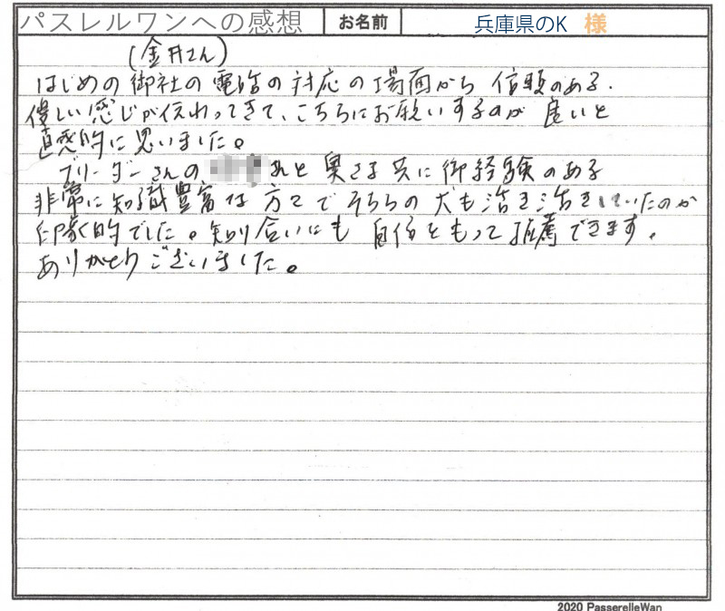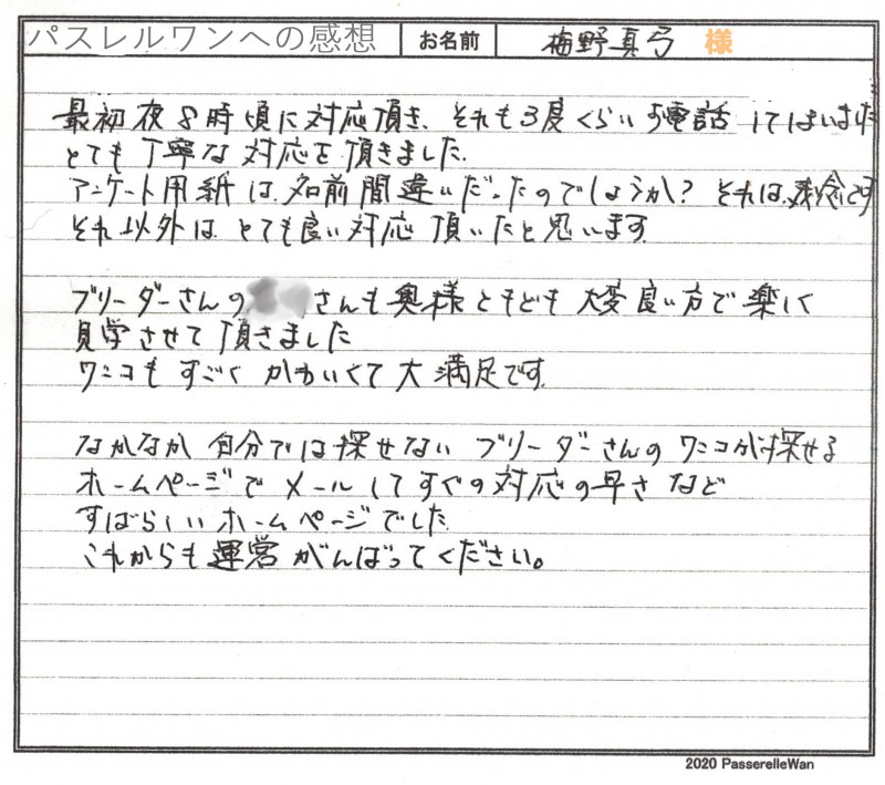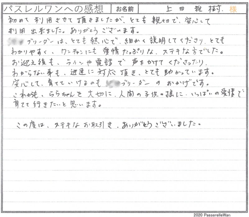 大阪府提携犬舎へご見学、お迎えと二度お越し頂きました。 ご見学以前には当事務局へご来社も下さっていたようで、その際はご対応出来ず失礼いたしました。 フレンチブルドッグは初めてとなり、ご見学の際に大切に抱っこされるお子様のお姿にくろまめちゃんの幸せを確信いたしました^^ ブリーダーさんもアットホームな暖かいご家族様へ良縁を頂戴し大変安心されております☆ 飼育で困った事などございましたらご遠慮なくご相談くださいませ! どうぞ素敵なフレンチブルドッグライフをお送りください・・・☆★☆ この度は当店をご利用いただき誠にありがとうございます。