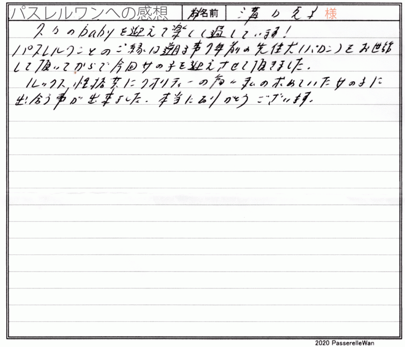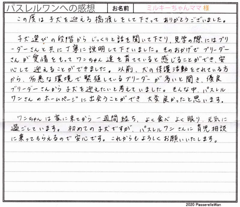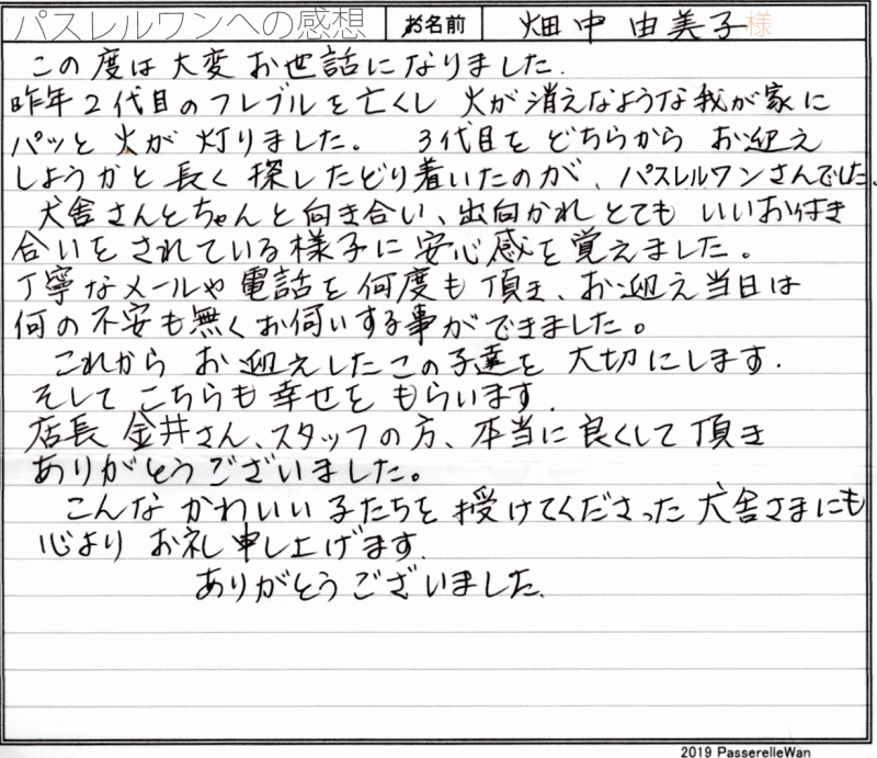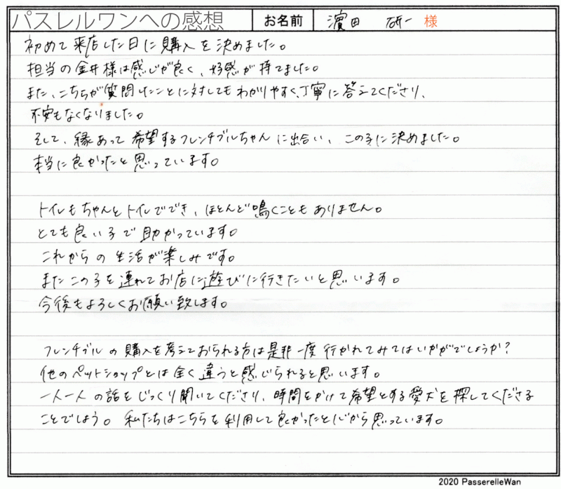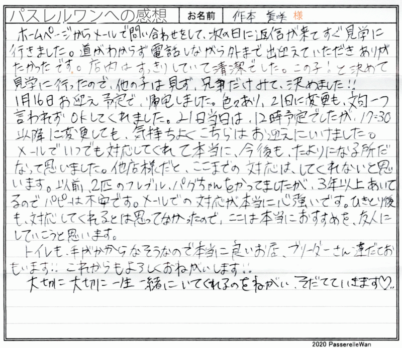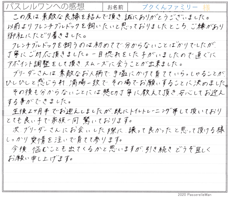子犬選びの窓口より当方へ子犬のご相談を頂戴し、むぎちゃんとの赤い糸が結ばれました^^ ご夫婦様共にはじめてのワンコのお迎えということもあり、ご不安な点の確認から、子犬選びのポイントなど、いろいろとお話をさせて頂きました。 その様な中で、むぎちゃんと良縁が結ばれ当方ブリーダーさん共に心より嬉しく思います。 困ったときにはいつでもご相談の上、お店(兼パスレルワン事務局)にもお気軽にお立ち寄りくださいませ! どうぞ、素敵なフレンチブルドッグライフをお送りください・・・☆★☆ この度は当店をご利用いただき誠にありがとうございます。