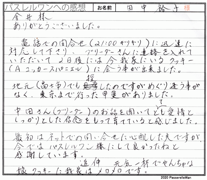 静岡県よりご見学、お迎えと二度東京都提携犬舎までお越し頂きました^^ 先住犬のコッカースパニエルが虹の橋を渡り、悲しみを乗り越えられこの度クッキーちゃんと良縁が結ばれましたm(__)m コッカー専門のバフでは国内トップを走る犬舎子犬をご覧頂き、安心して良縁を結ぶことが出来ました。 コッカーの経験豊富な暖かいご家族様に良縁を頂戴し当方ブリーダーさん共に心より嬉しく思います。 どうぞ、素敵なアメリカンコッカースパニエルライフをお送りください・・・☆★☆ この度は当店をご利用いただき誠にありがとうございます。