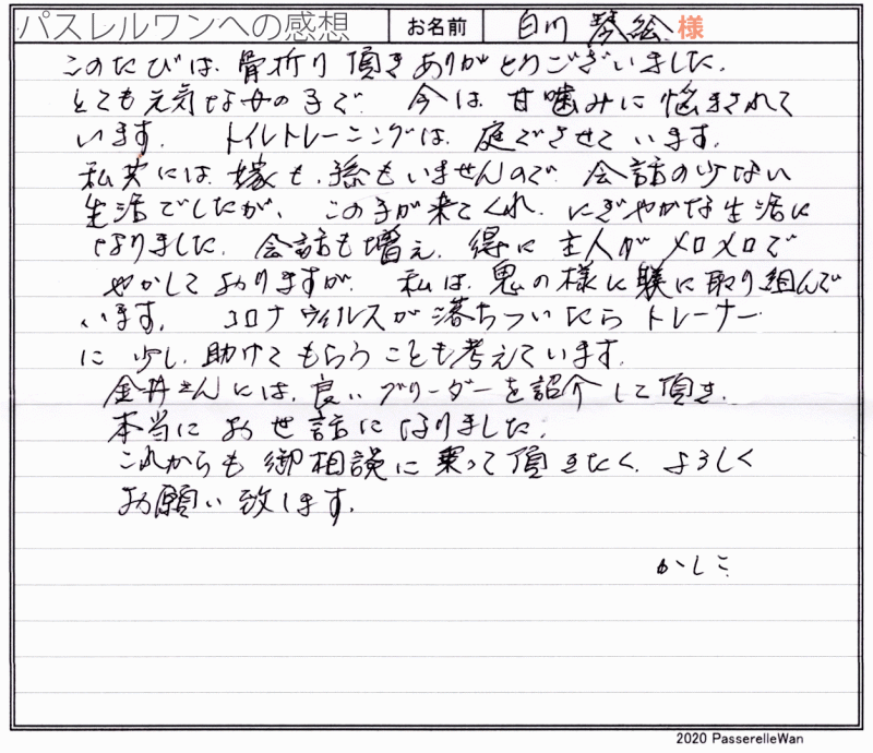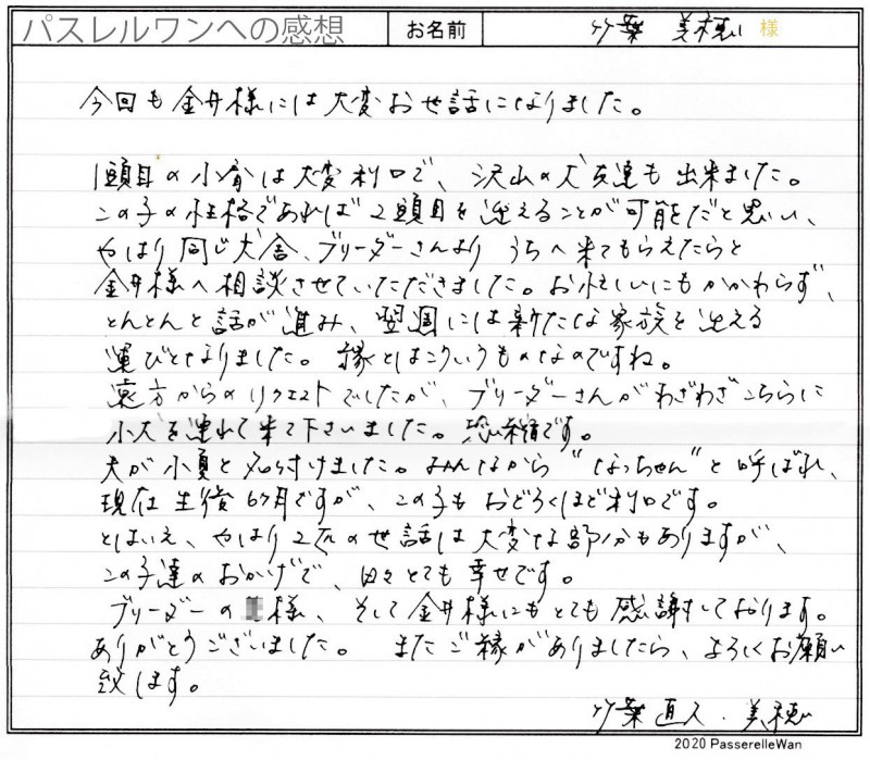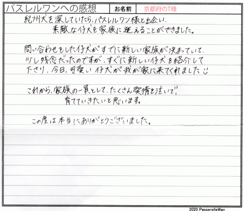 ご見学、お迎えと二度京都府より三重県提携犬舎までご見学にお越し頂きました^^ 先住犬も紀州犬の飼育経験がおありで、虹の橋を渡ってしまった悲しみを乗り越えられ、この度の良縁と至りました。 ご家族皆様で、ご兄妹の中から真剣な眼差しで、一員をお決めくださりました。 飼育経験もおありのご家族様より良縁を頂戴し当方ブリーダーさん共に安心しております。 どうぞ、素敵な紀州犬ライフをお送りください・・・☆★☆ この度は当店をご利用いただき誠にありがとうございます。
