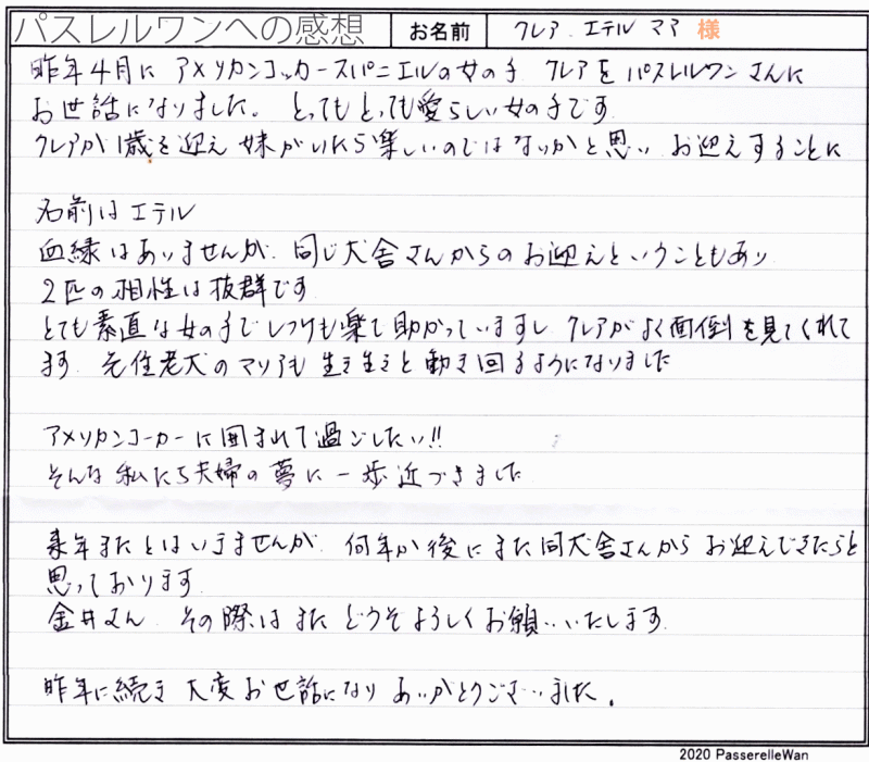 先住犬のクレアちゃんに続き、福岡県提携犬舎エテルちゃんへ良縁を頂戴しお迎え頂きました。 同じお里出身となりますので、息もピッタリのようで大変安心しております♪この度も滋賀県ご自宅までお届けさせていただきご家族様とも再会でき個人的にも大変楽しい一日でした^^ アットホームな大変暖かい愛犬家様でこの度はご多忙のご主人様ともお会い出来ました^^ 飼育に長けておられますご家族様ですので安心しておりますが、飼育で困ったこと等ございました際には、ご遠慮なく当方までご相談くださいませ! どうぞ、素敵なアメリカンコッカースパニエルライフをお送りください・・・☆★☆ この度は当店をご利用いただき誠にありがとうございます。
