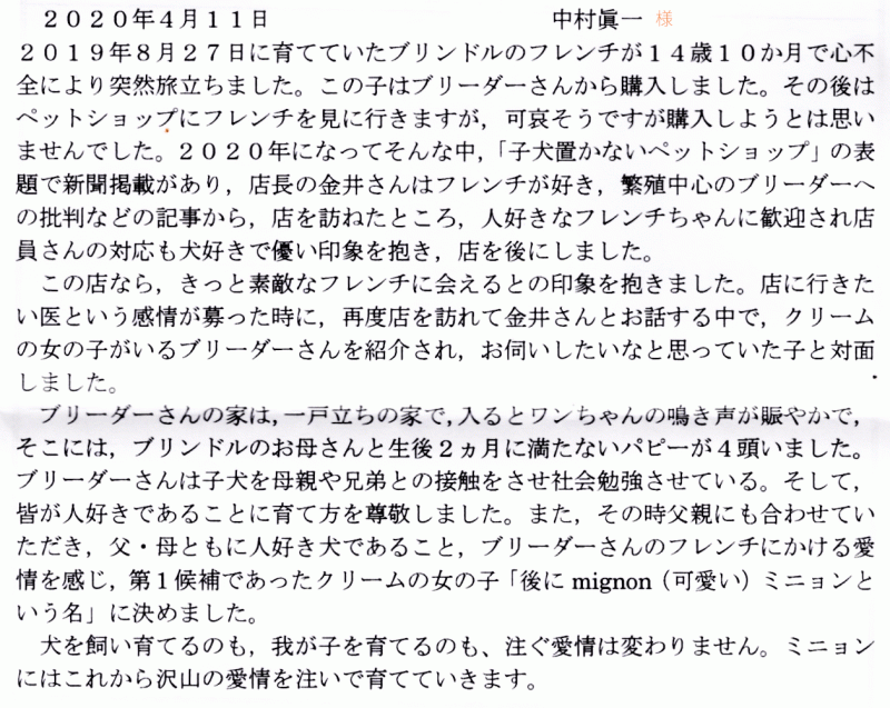 子犬選びの窓口よりご来社頂き、ご相談の上、当方大阪府提携犬舎クリーム女の子をご見学頂き良縁を頂戴いたしました。 お迎え後も、当店の方にも定期的にお越し頂き、ミニョンちゃんの成長を拝見出来嬉しく思っております☆ 最近日を見ることに横幅もついてきたミニョンちゃん、今後の成長もますます楽しみになってきましたね^^ 今後もお店の方含め、定期的に成長の様子をお見せくださいませ^^ どうぞ、素敵なフレンチブルドッグライフをお送りください・・・☆★☆ この度は当店をご利用いただき誠にありがとうございます。
