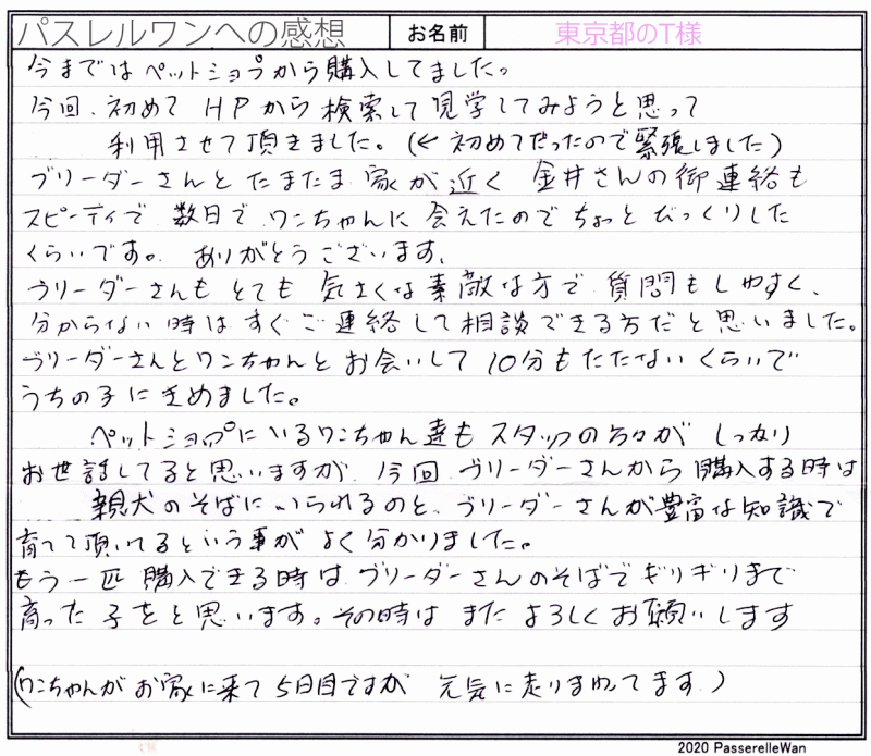 同県より東京都提携犬舎へご見学、お迎えと2度お越し頂きました。 今まではペットショップさんでお迎えされていたご家族様ですが、ブリーダーさんより直接迎えるというメリットを感じていただけて嬉しく思います。 はじめのお問い合わせで少し緊張頂いたようで、今後もお気遣いなく、いつでもご連絡ください! 飼育で困ったこと等ございました際には、ご遠慮なく当方までご相談くださいませ! どうぞ、素敵なアメリカンコッカースパニエルライフをお送りください・・・☆★☆ この度は当店をご利用いただき誠にありがとうございます。