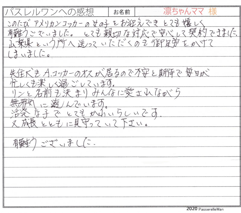 富山県より大阪府提携犬舎へご見学の上良縁を頂戴いたしました。 今回ご家族様の飼育は3度目となりますが、初めてブリーダーさんより直接お迎え頂きました。 "今回の子犬は一段と美しくしっかりした良い犬だと思います"との大変有りがいご意見に当方ブリーダーさん共に大変嬉しく思います^^ 富山の地でりんちゃんが幸せに育つことと、またの成長報告を楽しみにお待ちしております♪ どうぞ、素敵なアメリカンコッカースパニエルライフをお送りください・・・☆★☆ この度は当店をご利用いただき誠にありがとうございます。