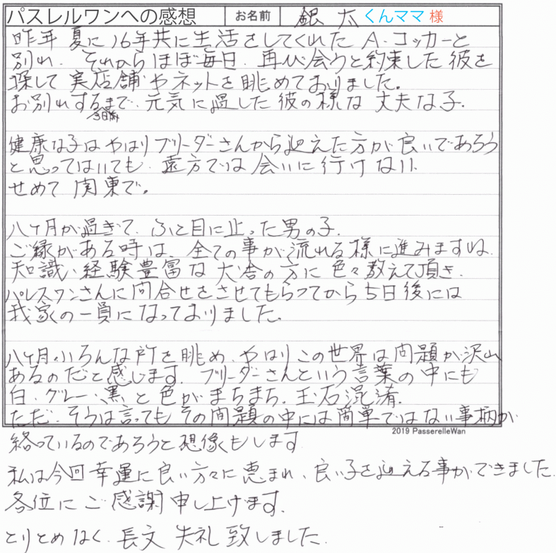 新潟県より東京都犬舎までご見学にお越し頂きました。 16歳で虹の橋を渡りました先住犬との再会を約束され、ずっと良縁を探しておられました。 そんな中、当サイトで募集しておりました銀太君をご覧になられ、この子に逢いたいと!と新潟県よりすぐにお越しくださいました。 出会ってからも銀太君の可愛さ、またブリーダーさんのサポートもあり、無事に良縁が結ばれ、再度コッカーライフをスタートすることが出来ました^^ 引き続きどうぞ、素敵なアメリカンコッカースパニエルライフをお送りください・・・☆★☆ この度は当店をご利用いただき誠にありがとうございます。
