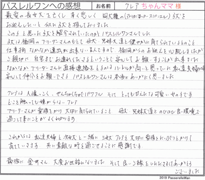 先住犬が虹の橋を渡られ、本当に辛い日々をお過ごしだったようです。そんな中当サイトで、こちらの福岡県出身クレアちゃんを見つけられ、タンの入り方やお顔立ちなどがそっくりで、お問い合わせくださいました。 ブリーダーさんに変わり、当方が伊丹空港で受取り、滋賀県のご自宅までお届けに上がらせて頂きました☆ 長女の子が虹の橋を渡り、次女っ子もとても寂しい日々を過ごしていたようで、クレアちゃんをお届けに上がらせて頂いた時には二頭の距離感がとてもほのぼのとして、和まされました^^ これからご夫婦様にも辛い日々を送られた分、先住犬の子で培った経験を、次女っ子、三女となりましたクレアちゃんへ注いであげてください!そして皆様に笑顔が戻って嬉しく思います! どうぞ、素敵なアメリカンコッカースパニエルライフをお送りください・・・☆★☆ この度は当店をご利用いただき誠にありがとうございます。
