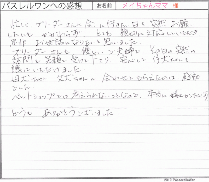 東京都犬舎へご見学の上、良縁が結ばれ当日埼玉県ご自宅へご一緒にお連れ帰り頂きました。 ご見学の日時を決めるまでは、ご出張が多いパパ様のご調整も大変だったことと思います。 ただ、この子に運命的な縁を感じてくださった娘様のためにもパパ様頑張ってご出張先の三重県より帰ってきてくださいました。 実物の子犬は当然ながらお写真や動画と比べ物になることもなく大変気に入っていただけました^^嬉しいお言葉も仕事冥利に尽きる思いでございます! 埼玉県の地で、どうぞ素敵なフレンチブルドッグライフをお送りください・・・☆★☆ この度は当店をご利用いただき誠にありがとうございます。