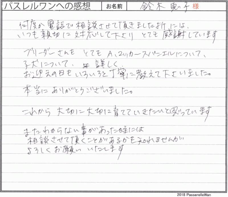 福岡県のコッカー専門ブリーダーさんの所で、大事に育てられました、お引渡しは伊丹空港にて代行説明を実施の上、お引渡しさせて頂きました。 元トリマーのご家族様、大好きな飼い主さんにカットをしてもらえる紅子ちゃんは本当に幸せ者ですね^^ お引渡しの際には、お手土産まで頂戴しお心遣いもありがとうございました。当方もご家族様とお逢いできとても暖かい愛犬家様にこの子は巣立ち、ブリーダーさん共々安心しております。 どうぞ、素敵なアメリカンコッカースパニエルライフをお送りください・・・☆★☆ この度は当店をご利用いただき誠にありがとうございます。