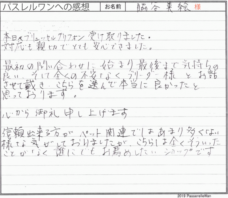 兵庫県より和歌山県犬舎までお迎えにお越しくださいました。 以前は、他犬種でドッグショー出陳、優良な成績を挙げられたこともある、ご家族様です。 そんなプロのご家族様にも、当方おすすめの和歌山県犬舎にて、良質な犬質に大変喜んで頂けました^^ ブリーダーさんもワンコ思いの暖かいご家族様とのこの度の良縁を大変喜んでおられます☆ これから成長しました様子など是非宜しければお知らせください♪ 引き続きどうぞ、素敵なブリュッセルグリフォンライフをお送りください・・・☆★☆ この度は当店をご利用いただき誠にありがとうございます。