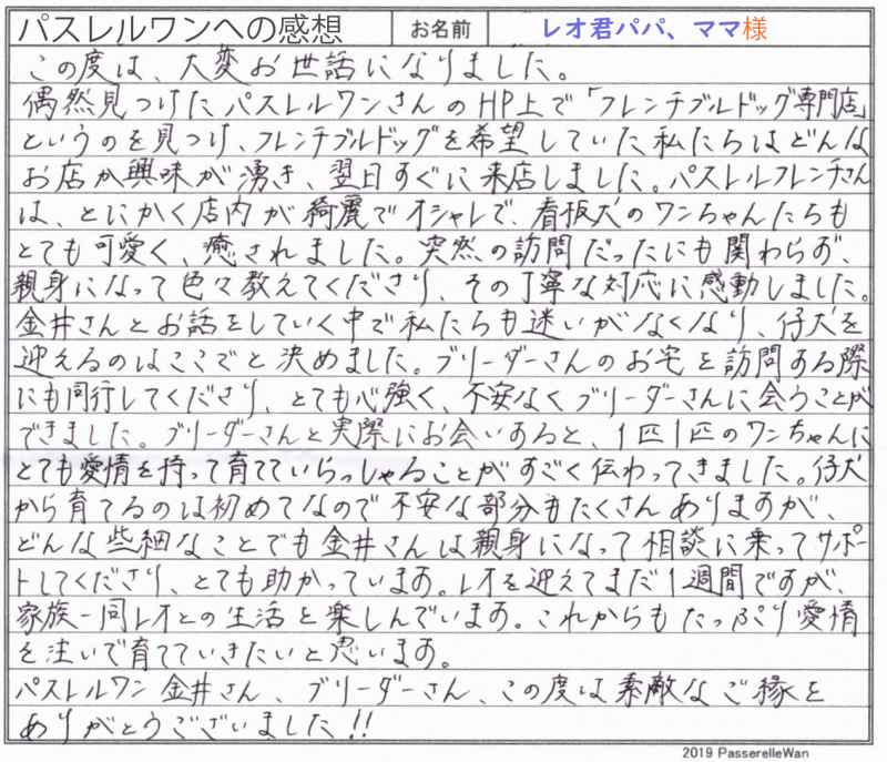 当方が運営しておりますフレンチブルドッグ専門店をお探しくださり、子犬選びの窓口のドアをたたいてくださいました。 奥様が以前実家ででワンコを飼育された経験がある以外、子犬からの子育てははじめてとのことでご不安な点含め色々とご相談いただきました。 ブラックブリンドルの可愛いエプロンの大きめの優良児をお探しで、ご家族様のお迎えご希望時期にタイミングよく当方提携犬舎の方で、可愛い子が生まれており、レオ君とは運命の赤い糸で結ばれていたのだと思います♪ これから本格的な子育ても開始し、ご不安なことやご質問も出てくると子と思います。その際にはご遠慮なくご相談ください! どうぞ、素敵なフレンチブルドッグライフをお送りください・・・☆★☆ この度は当店をご利用いただき誠にありがとうございます。