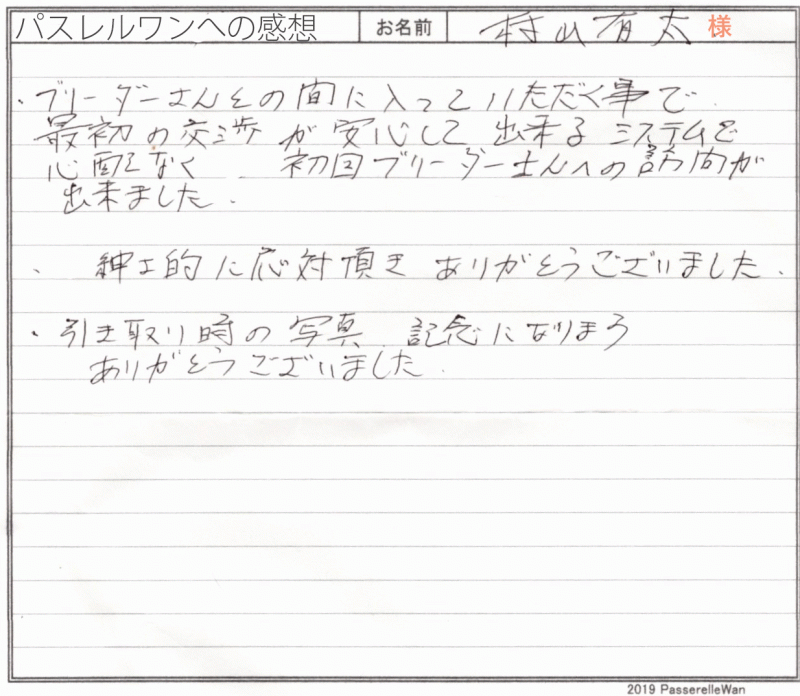 愛知県より三重県犬舎まで紀州犬のご見学にお越しくださり、良縁をお結びいただ当日ご一緒にお迎え頂きました。 以前の日本犬を飼育させれておられたご家族様、この度は、先住犬に面影が大変似ている紀州犬を迎えられたいとお問い合わせくださいました。 ご見学当日はお子様もご一緒にお越しくださり、本当にワンコがお好きなご家族様というのが当方ブリーダーさん共に伝わってきて大変安心することが出来ました^^ 飼い主に忠実な紀州犬、これからご家族様との絆を深めていってくれることを願っております♪「 どうぞ、素敵な紀州犬ライフをお送りください・・・☆★☆ この度は当店をご利用いただき誠にありがとうございます。