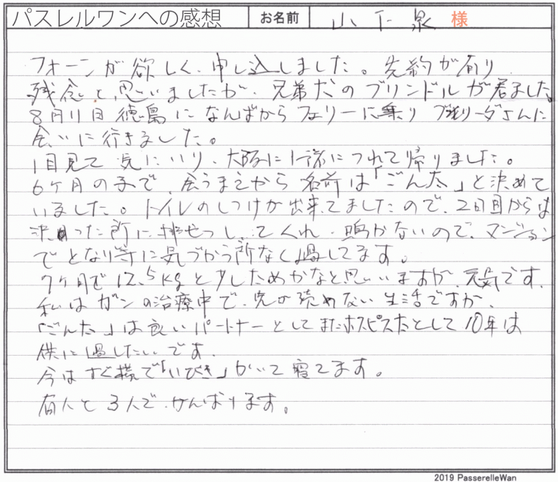 大阪府より徳島県犬舎までフェリーを乗り継ぎご見学の上、良縁が結ばれお迎え頂きました。 もともとはフォーンの子をお問い合わせいただきましたが、ご見学後大変気に入っていただけましたごん太君との赤い糸が結ばれていたのだと思います^^ また、お迎え当日、その後も当事務局兼パスれフレンチ(フレンチブルドッグ専門店)まで良く遊びに下さり大変うれしい限りでございます☆ 今後もどうぞよろしくお願い申し上げます。困った際にはいつでもお店へご来店くださいませ! どうぞ、素敵なフレンチブルドッグライフをお送りください・・・☆★☆ この度は当店をご利用いただき誠にありがとうございます。