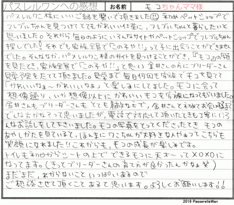 先住犬ともフレンチブルドッグと暮らされてこられました大のフレンチブル好きのご愛犬家様です。 フォーンのリールちゃんへ良縁を感じてくださり、名古屋駅にてブリーダーさんよりお引渡しさせて頂きました。 お迎え後も我が子として大事に育ててくださり、成長報告も大変うれしく思います^^ これからお久しぶりの子育てで、ご不安なことがありました際にはご遠慮なくご相談ください!是非ワクチンプログラムが完了しましたら、パスレルフレンチ(事務局)の方にも遊びにお越しくださいましたら幸いでございます。 どうぞ、素敵なフレンチブルドッグライフをお送りください・・・☆★☆ この度は当店をご利用いただき誠にありがとうございます。