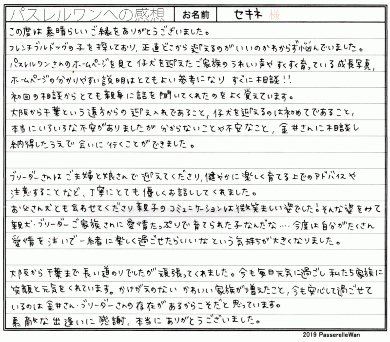 はじめてワンコを飼われたいとのことでご不安もある中、当方へご相談、子犬のリクエストを頂戴したところからスタートいたしました。 ご家族様のご希望もお伺いする中で、大阪府の提携犬舎の方へご見学にお越し頂くことなりました。 当日は千葉県より新幹線でお越しくださり、よっちゃんとの運命的な出会いを果たすこととなりました^^ お迎え後も初めての子育てですが、順調なようで何よりでございます。当方へお土産もお送りくださりお心遣いに感謝申し上げます。 千葉県の地で、どうぞ素敵なフレンチブルドッグライフをお送りください・・・☆★☆ この度は当店をご利用いただき誠にありがとうございます。