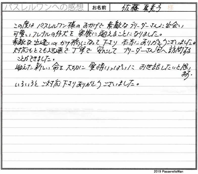 大阪府提携犬舎へご見学・お迎えと2度お越しくださいました。 ご見学の際にはお子様方もご一緒に、素敵な笑顔が飛び交い楽しい時間を過ごせました^^ アラレちゃん、とても可愛いお名前も命名くださり、元気一杯ご家族様の元育っております♪ 飼育の中で、何かお困りごとがございました際には、引き続きご遠慮なく当方までお問い合わせください! どうぞ素敵なフレンチブルドッグライフをお送りください・・・☆★☆ この度は当店をご利用いただき誠にありがとうございます。