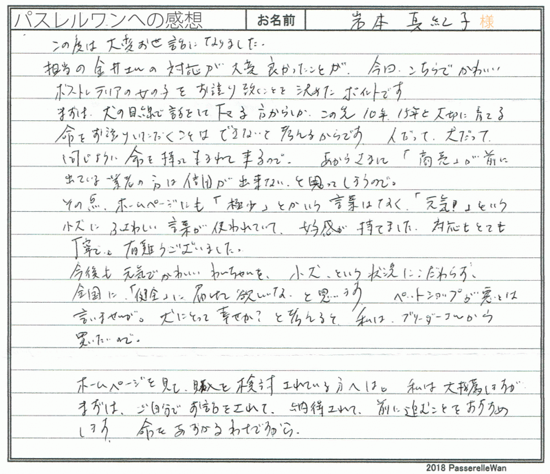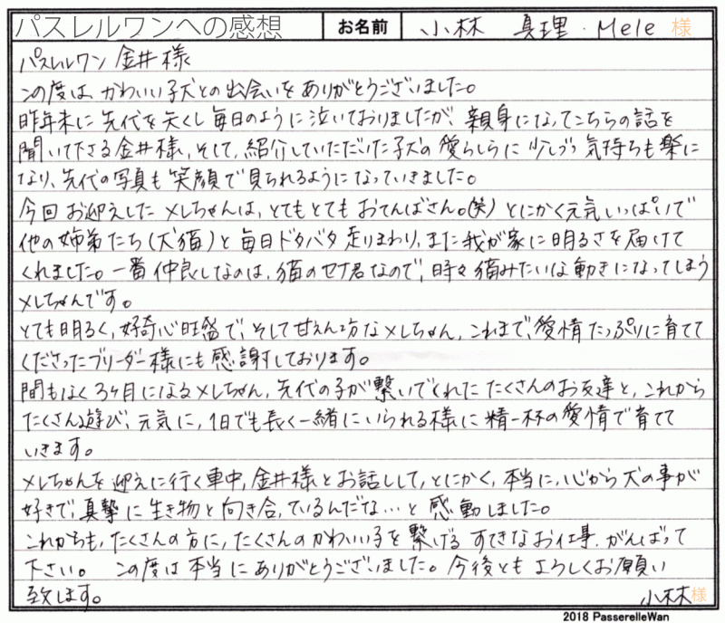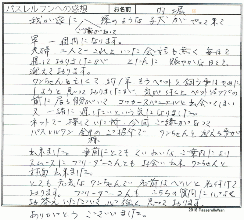 埼玉県より新幹線で奈良県犬舎までお越しくださいました。 先住犬の子が虹の橋を渡り、悲しみの中、新しい良縁を願い当方へお問い合わせくださいました。 新大阪駅で合流の上、犬舎までご送迎もご担当させて頂き、車内でたくさんのお話をご家族様とさせて頂きました☆ ペット先進国にまだまだ劣る日本のペット社会についても熱いお話をさせて頂き、あっという間に奈良県犬舎へ到着いたしましたねw お迎え後も大事に大事にメレちゃんを育てくださり、当方ブリーダーさん共に大変安心しております^^ 引き続きどうぞ、素敵なアメリカンコッカースパニエルライフをお送りください・・・☆★☆ この度は当店をご利用いただき誠にありがとうございます。