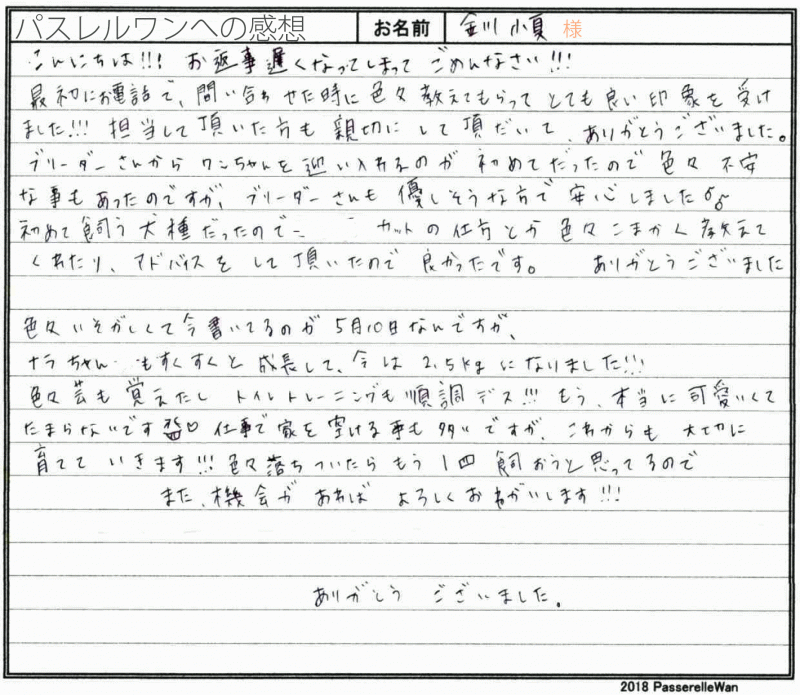 大阪府より奈良県犬舎へ、ご見学・お迎えとお越し頂きました。 長年ワンコと暮らされておられます大の愛犬家ご家族様です。この度は娘様と一緒にクラスコッカースパニエルとの良縁を探されて折れました☆ ご見学日にはお母様のお姉さまもご一緒にお越し頂き、皆様満場一致でナラちゃんを気に入って頂けました^^ お名前の由来は、もちろん奈良県の"ナラ"より、いただきました(笑) 本当に可愛い!と日々喜んで頂けているようで当方ブリーダーさん共に心より嬉しく思います。 引き続きどうぞ、素敵なアメリカンコッカースパニエルライフをお送りください・・・☆★☆ この度は当店をご利用いただき誠にありがとうございます。