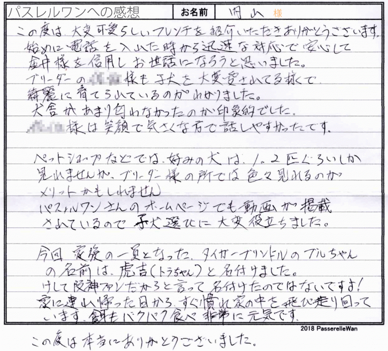 大阪府犬舎までご見学頂き、良縁の末、ご一緒にお連れ帰り頂きました。 先住犬もフレンチブルドッグを飼育されておられましたが、虹の橋を渡り、新しい一員を探され、この度虎吉くんと良縁となりました^^ ネーミングを聞いた時に、私もタ〇ガースの影響があるのかと、、考えてしまいました(笑) とても明るいご主人様の元、明るい性格の虎吉君はきっと幸せに楽しく過ごしていくことと思います♪ どうぞ、素敵なフレンチブルドッグライフをお送りください・・・☆★☆ この度は当店をご利用いただき誠にありがとうございます。