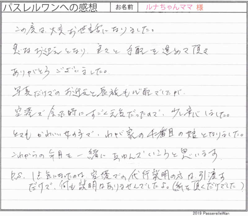 羽田空港にて当方羽田空港担当Uさんの代行説明を実施の上お引渡しをさせて頂きました。 以前は当事務局よりお近くにお住まいという事もあり、距離はございましたがどこか親近感のある中ご対応させて頂けました☆ 常にひなたちゃんの体調を最優先にお考えくださり、暖かいご家族様のお心遣いが毎回嬉しく感じておりました。 お迎え後も、日々やんちゃさも増してきているひなたちゃんだと思いますが(笑)楽しそうに子育てくださっているようで何よりでございます♪ 引き続きどうぞ、素敵なボストンテリアライフをお送りください・・・☆★☆ この度は当店をご利用いただき誠にありがとうございます。