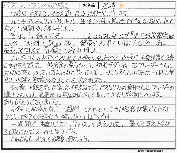 大阪府ブリーダーさん宅までご見学お迎えと2度足を運んでくださいました。 ペットショップさん等フレンチブルドッグをご見学に行ってみたようですが、ご見学頂きました小鉄君の毛艶、容姿など、その違いにすぐにご縁を結んで頂きました^^ ダンディーなブリーダーさんともお話が合ったようで、安心してお迎えいただけたようで大変うれしく思います☆ これから、飼育の中で困ったことなどございましたらお気遣いなくいつでも当方ブリーダーさんまでご相談ください。影ながらサポートさせて頂く所存でございます。 このたびは当店をご利用いただき誠にありがとうございました。