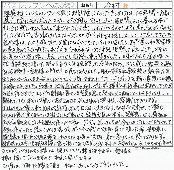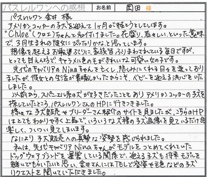 神奈川県より東京都犬舎までご見学・お迎えと2度お越しくださいました。 先住犬が虹の橋を渡り、悲しみの中、当方へお問い合わせ下さり、ご家族様のご希望を細かくお伺いさせて頂きました。 可愛いオーダーメイド主体でドッグウェアのショップを手掛けておられるご家族様、先住犬キャバリアのNinaちゃんはショップの看板モデルも担っておりました。 この度お迎えいただきましたクロエちゃんもいずれショップの看板犬として大活躍してくれることを今から期待しております^^きっとクロエちゃんなら人気者になること間違いなしです^^ 子育てにまだまだ大変な時期が続くとは思いますが、ご感想でお書き頂いた通り気負うことなく、困った時はいつでも当方までご相談ください! 先住犬で培った経験も是非活かしつつ、楽しい素敵なコッカーライフをお送りください・・・☆★☆ このたびは当店をご利用いただき誠にありがとうございました。