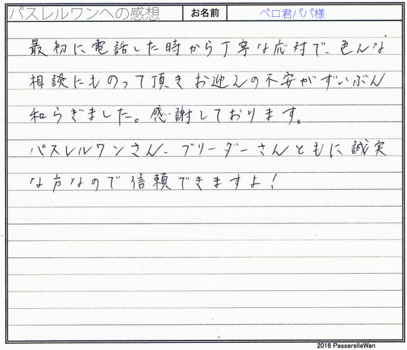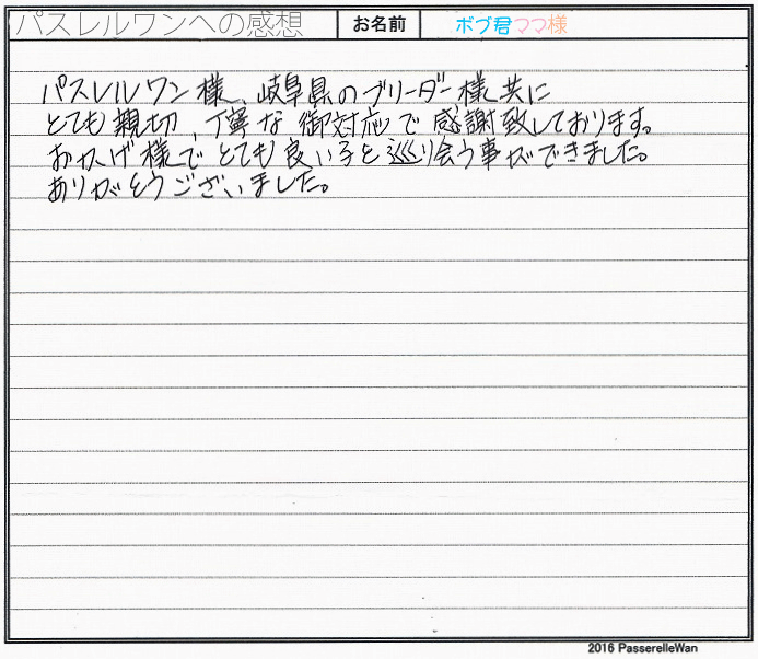 お迎えの際は徳島県より大阪府犬舎までお越しくださいました。 いろいろとご不安もおありだったことと思いますが、当方ブリーダーさんをご信頼頂き感謝申し上げます。 ブリーダーさんは自身のところで産ませた子たちのみを直販という形で店舗も構えておられます。 少し説明不足があったようでびっくりさせてしまい申し訳ございません。直接ブリーダーさん、両親犬もご覧頂き、その犬質の高さにご納得下さり光栄でございます。 これからも徳島県の地でうららちゃんがどのようなチワワライフを送っていくのかとても楽しみです^^ また是非成長報告などお待ちしております☆ この度は当店をご利用いただき誠にありがとうございます。