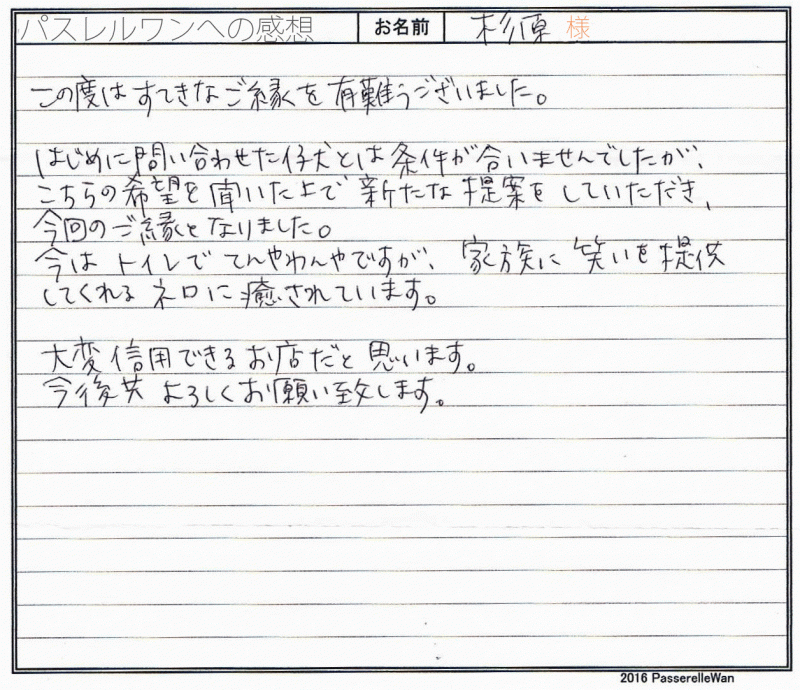 当方へ優先登録を頂戴し、ご見学にお越しくださりメイちゃんへご縁を頂戴いたしました。 お迎えの際は当方が兵庫県のご自宅までお届けに上がらせて頂きました。 ご見学の時よりもしっかりとした体つき・動きにとても安心して頂けました^^ 多方面で大いにご活躍されておられますご家族様からの温かい貴重なお言葉、しっかりと受け止めてまいります。 今後も期待を裏切らぬよう、今後も日々皆様のお役にたてますよう、喜んで頂けますよう企業努力に努めてまいります! また是非近くに寄りました際にはお言葉に甘え成長の様子を拝見しに参ります^^ このたびは当店をご利用いただき誠にありがとうございました。