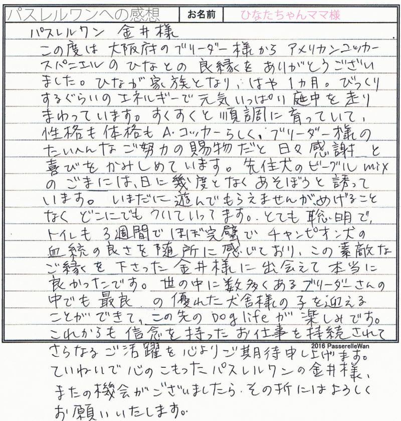神奈川県よりご姉妹様で大阪府犬舎までご見学にお越しくださいました。 ご見学当日は新大阪駅にて当方社用車で送迎させて頂き、車内でワンコへの温かい思いをお聞かせ頂きました。アメリカへ長くお住まいになられていたご家族様、本場のワンコへの考え方、また愛情が伝わって来て既に犬舎へ向かう車中で素敵なご家族様にご見学にお越し頂き嬉しく感じておりました。 ご見学後もご姉妹様共に大変喜んで頂け、ひなたちゃんをご家族様の一員としてお迎え頂けることとなりました。 後日お迎えの際は、伊丹空港から羽田空港へ空輸させて頂き、無事Yご家族様の元へ巣立ってまいりました。 アメリカンコッカースパニエル専門に長年尽力してこられたブリーダーさんもY様の温かいお言葉に喜んで頂けることでしょう^^ この度は当店をご利用いただき誠にありがとうございます。