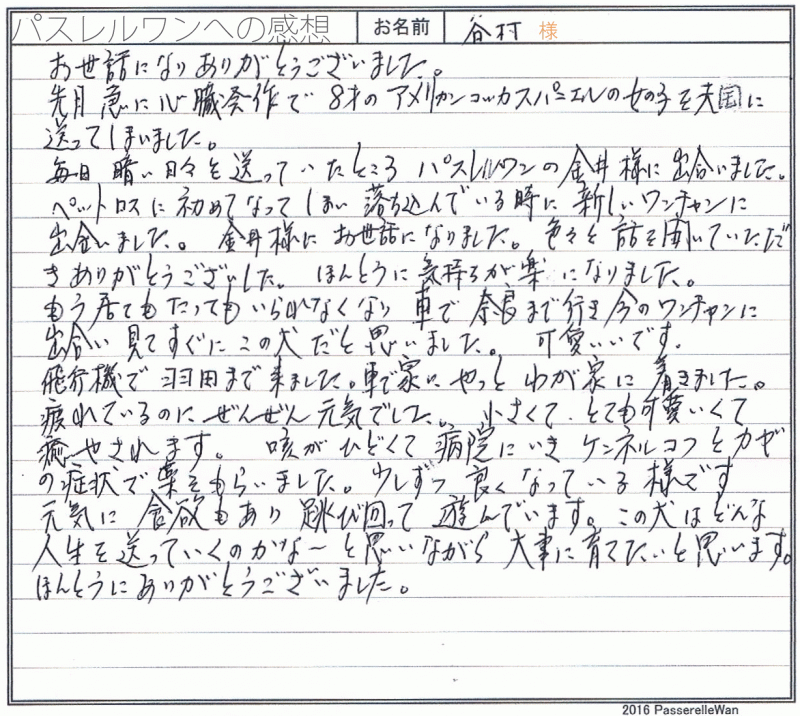 埼玉県より奈良県犬舎まで子犬へ逢いにお車でお越し頂きました。 先住犬のアメリカンコッカースパニエルが虹の橋を渡られ、毎日先住犬を追うペットロスの状況が続いており、このままでは・・・、と意を決し当方にて募集中の子犬へ逢いに片道6時間以上掛けお越し下さいました。 ご見学の際はブリーダーさんへ、先住犬へのたくさんの想いを語って下さり、温かいご家族様にご縁を頂戴致しましたこと喜んでおります。 お迎えの際は、当方で一日お預かりの上、伊丹空港から羽田空港へ空輸にてお引き渡しさせて頂きました。空港にお預けの手続きが完了するまで元気一杯、咳等一回もなかったのですが・・、空輸の際のストレス、貨物に同乗していた他の子に同様の菌を持った子がいたのでは・・と、原因が気になる所ではございますが、しっかり完治して頂けますようサポートしてまいりますのでどうぞご安心下さいませ! 今後素敵なコッカーライフを送って頂けますよう精一杯努めてまいります・・・☆★☆ この度は当店をご利用いただき誠にありがとうございます。