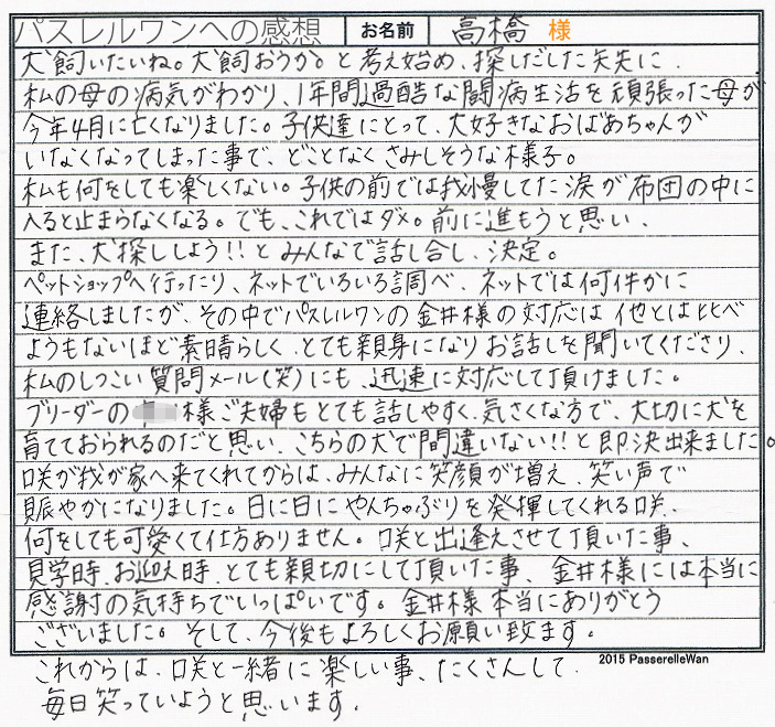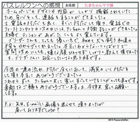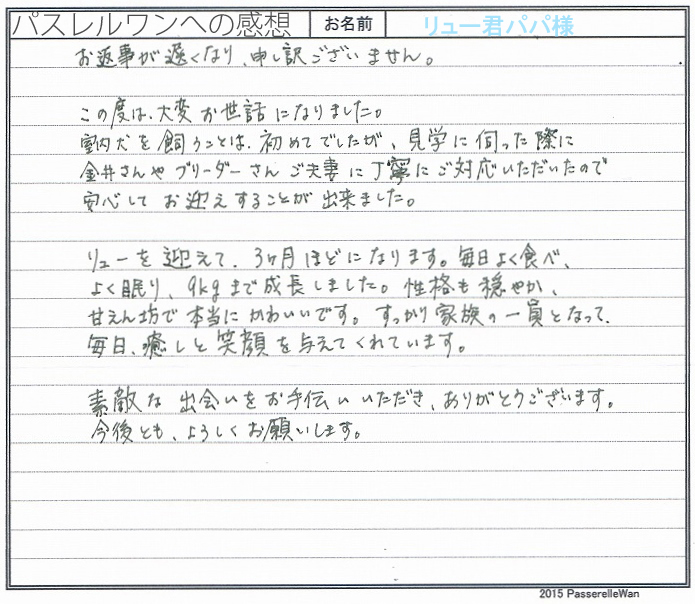 こだわり派の中西様に子犬を気に入って頂きとても嬉しく思います。 らんちゃんをお迎え後広いご自宅を自由気ままに走らせてあげ、優しいお言葉で出迎えてくださいました。 お引渡しの際もたくさんのお話を聞かせて頂き大変勉強になりました。 貴重なお写真も拝見でき、ありがとうござます。 わんこに長けおられるご家族様ですので当方ブリーダーさん共に安心しております^^ このたびは当店をご利用いただき誠にありがとうございました。