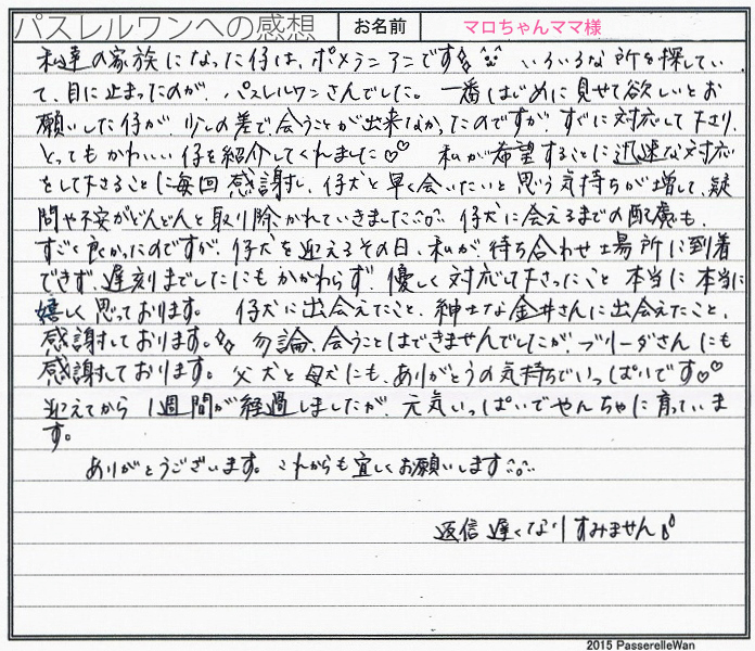 掲載中の子犬をとても気に入ってくださりご夫婦様で和歌山県犬舎まで足を運んでくださいました。 ブリーダーさんも素敵なご家族様にお迎え頂けてとても喜んでおられました^^ いろいろとお気遣いくださり、またたまちゃんを大事に育てて下さり感謝申し上げます。 またたまちゃんが成長しましたら是非和歌山県のブリーダーさんの所へお里帰りして下さい☆ 何か困ったことがございましたらいつでもお気軽に当方までご連絡下さい! このたびは当店をご利用いただき誠にありがとうございました。