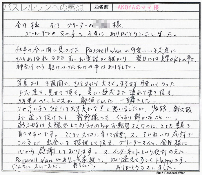 お仕事柄お休みがなかなか取れないご多忙の中、三重県まで新幹線、電車を乗り継ぎご見学にお越しくださいました。 3年半のペットロスを乗り越えて頂き、解消できる良縁をおつなぎ出来た事、本当に嬉しく思います。 新大阪駅まで送迎させて頂いている才、ご家族様のあこやちゃんを大事に我が子として見守る姿がとても優しくて素敵なお時間を共有させて頂きました。 これからあこやちゃんとのゴールデンライフ、素敵な日々をお過ごしください・・・☆★☆大型犬は成長が早いので今のうちにたくさん抱っこしてください☆ このたびは当店をご利用いただき誠にありがとうございました。