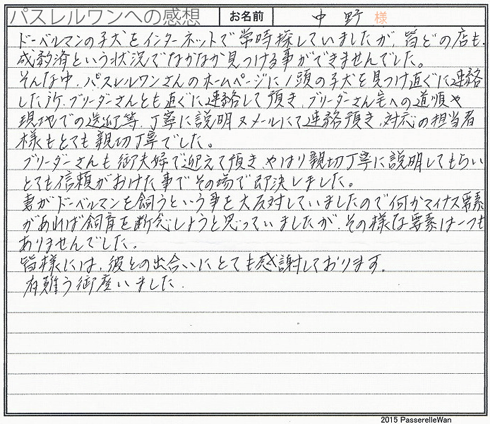 いろいろな大型犬を飼って来られたご経験のあるご家族様、この度優秀なドーベルマン子犬を探されておられました。 日本でもトップクラスのドーベルマンをブリーディングしておられる兵庫県の犬舎まで神奈川県より新幹線を乗り継ぎはるばるご見学にお越しくださいました。 実際の子犬をご覧になられてご家族様もご納得の素晴らしい出会いとなったようです^^素敵な良縁となり心より嬉しく思います。 今後飼育の面で困ったことなどございましたらお気軽に当方、ブリーダーさんまでご連絡下さい! このたびは当店をご利用いただき誠にありがとうございました。