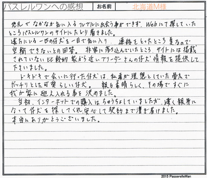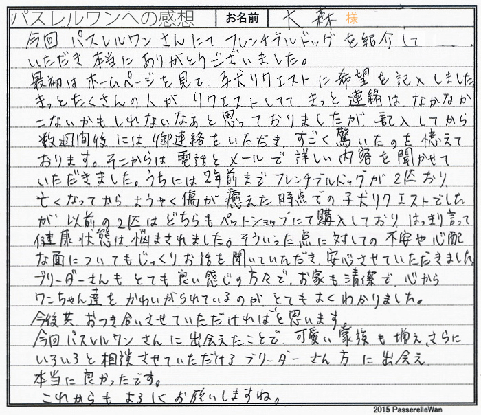なかなか近隣で素敵な出会いに出会えずご苦労されたようでしたが、今回北海道提携ブリーダーさんの元で素敵な出会いとなり心より嬉しく思います。 当方も絶大の信頼を置くブリーダーさんの子犬はもちろんのこと、親犬もご覧頂き違いをご理解いただけたようで、安心いたしました^^ 困ったことがございましたらブリーダーさん共々お気軽にご相談ください! これから、自然豊かな北海道の地で、素敵なフレンチブルドッグライフをお送りください・・・☆★☆ このたびは当店をご利用いただき誠にありがとうございました。