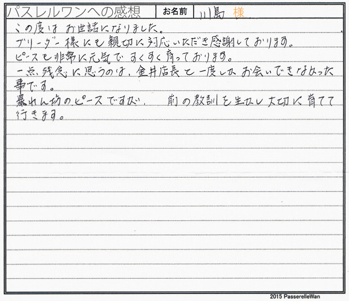 ご見学、お迎えと2度千葉県より足を運んでくださいました。お迎えの際はお立会いが出来ませんでしたが、愛娘様とお迎えにお越しくださり、楽しいひとときをお過ごしいただけたようです^^ 元気そうに育っているピース君の姿に安心しております^^ また兄弟のモス君も東京に巣立っておりますので関東で兄弟同士の再会があれば素敵ですね^^ このたびは当店をご利用いただき誠にありがとうございました。